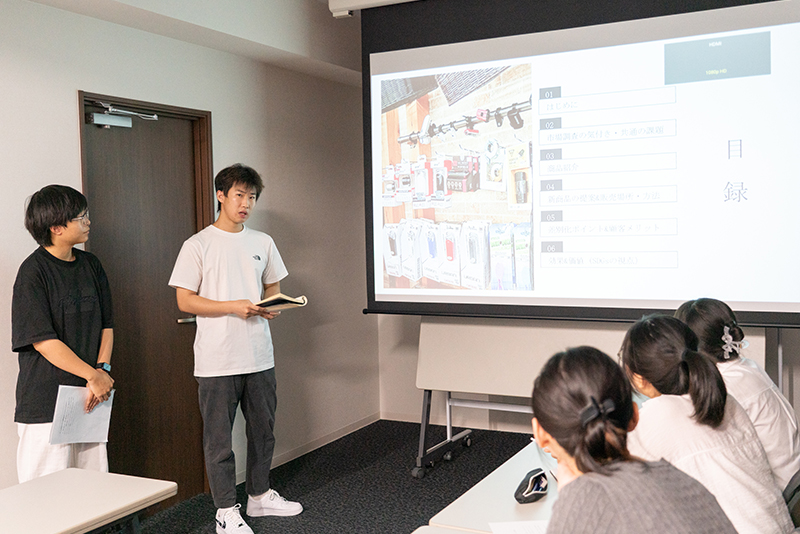 (リュウさん)私は、今回のインターンシップを通じて、ビジネスにおける課題との向き合い方を学びました。例えば顧客対応の体験では、これまでの私は「どうやりたいか」という自分の意思を優先しがちだったことに気づき、お客様の立場に立って「どうすべきか」を考える大切さを実感しました。また、社員の方々の仕事への熱意に刺激を受ける一方で、新製品の企画発表の場では、自分の知識不足や視野の狭さにも気づくことができました。今後はこれらを意識して改善していきたいと思います。